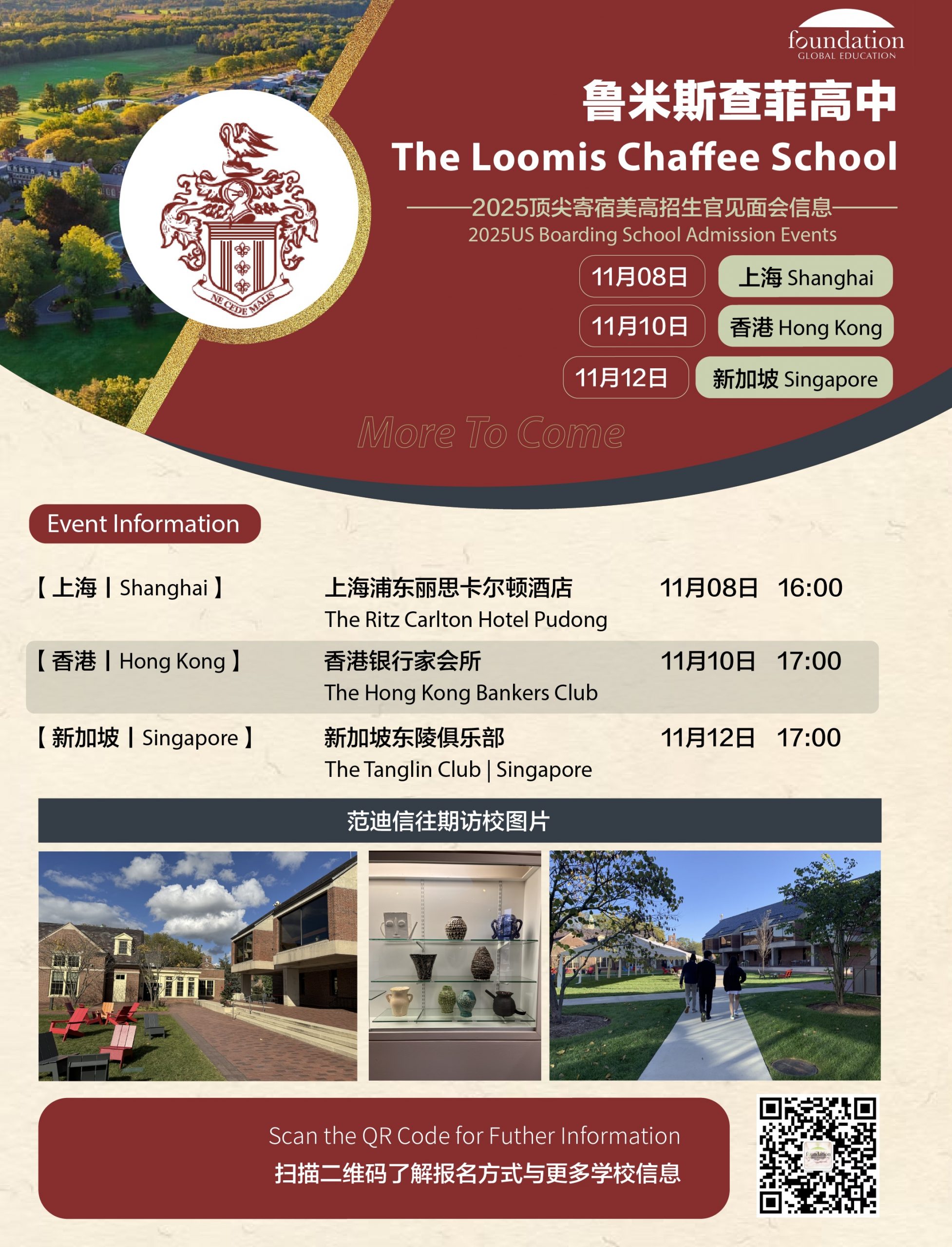 We are pleased to share that The Loomis Chaffee School will be hosting its official admission information sessions in Shanghai, Hong Kong, and Singapore this November. Families will have the valuable opportunity to meet directly with Loomis Chaffee’s admissions representatives to learn about the school’s academic excellence, vibrant community, and diverse extracurricular programs.