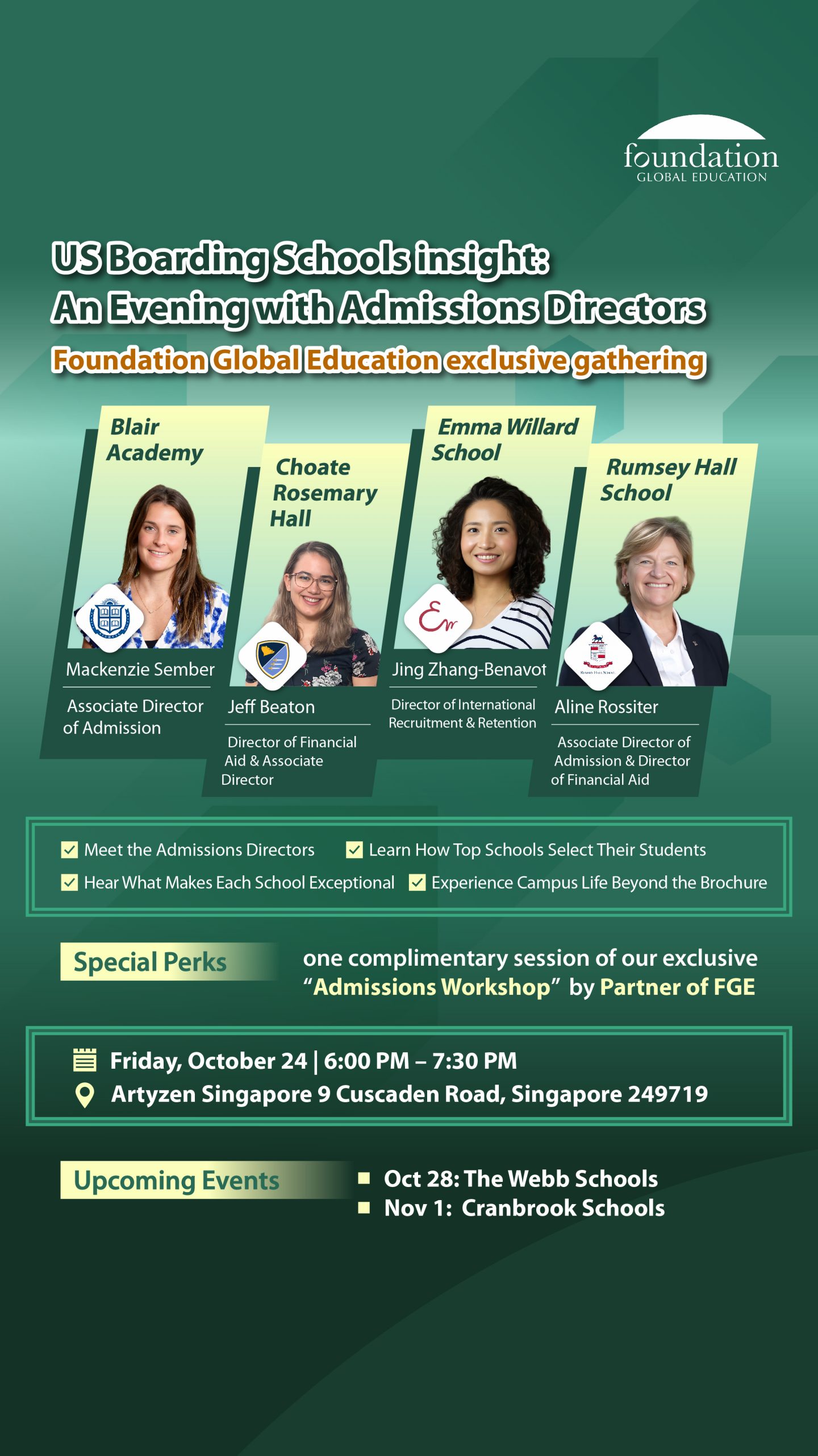 Foundation Global Education Exclusive Gathering. Join us for an exclusive in-person event hosted by Foundation Global Education, where families will have the unique opportunity to meet and engage directly with Admissions Directors from four top U.S. boarding schools.